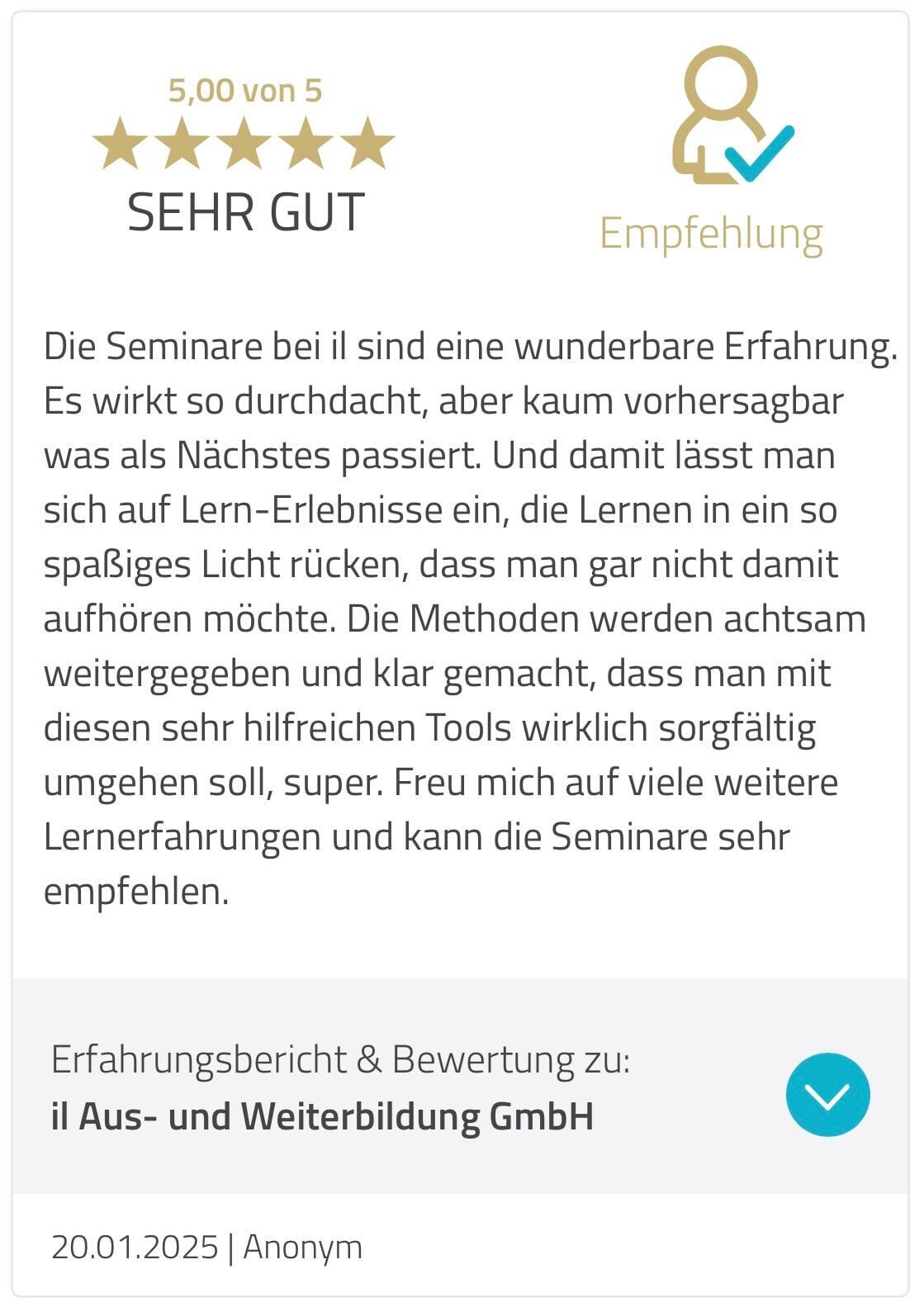 Supergeniale Weiterbildungen, die meine Erwartungen bei weitem übertroffen haben […] Professionell, klar und lustvoll-kreativ in der Vermittlung der Inhalte. […]
