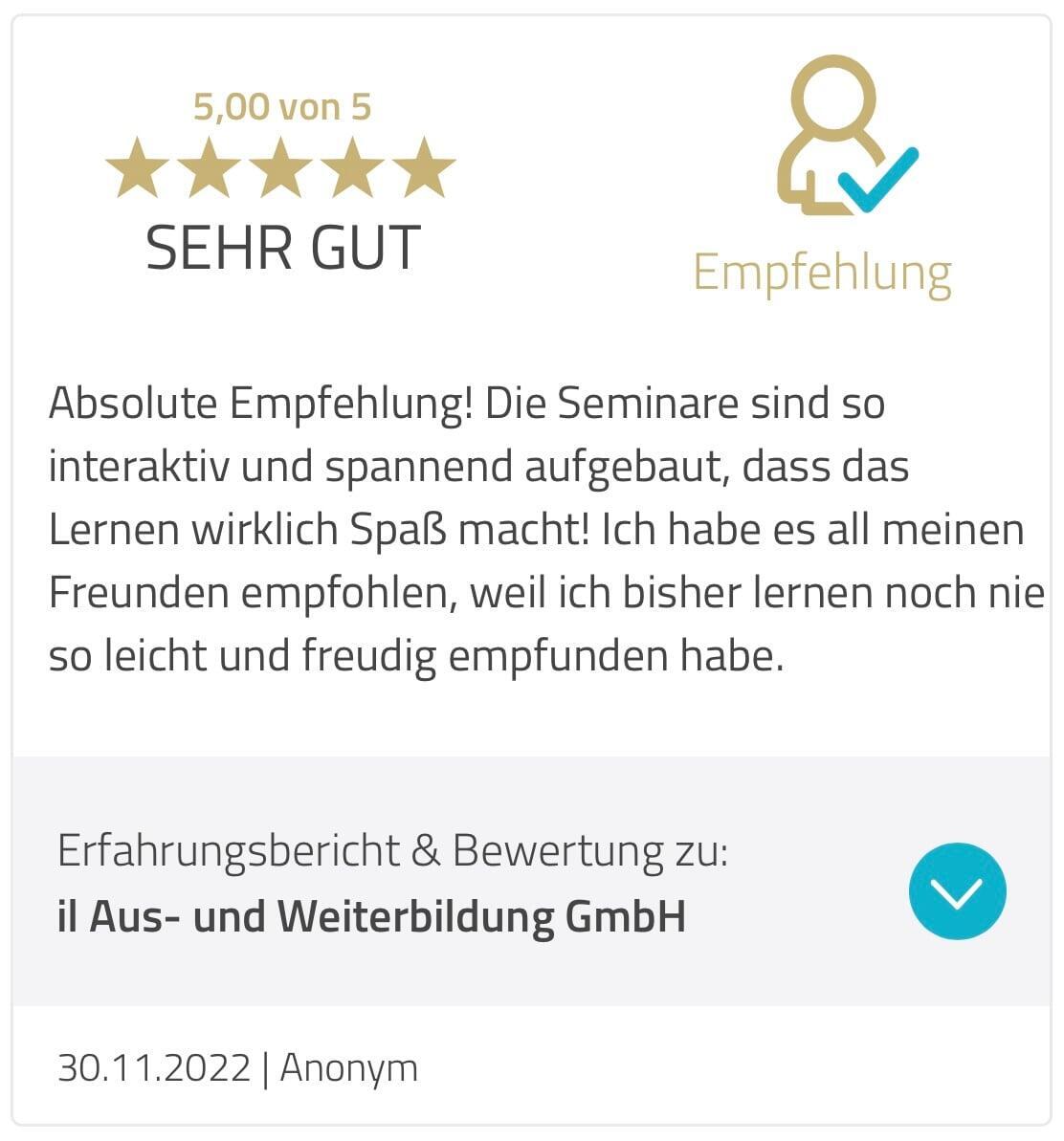 Das il Institut steht für professionelle Ausbildungen mit Herz, Hirn und Hand – und genau das spürst du auch. Hier lernst du nicht nur Methoden, sondern erlebst ein ganzheitliches Lernumfeld, das auf persönliche Entwicklung, echte Verbindung und nachhaltiges Wachstum ausgerichtet ist.